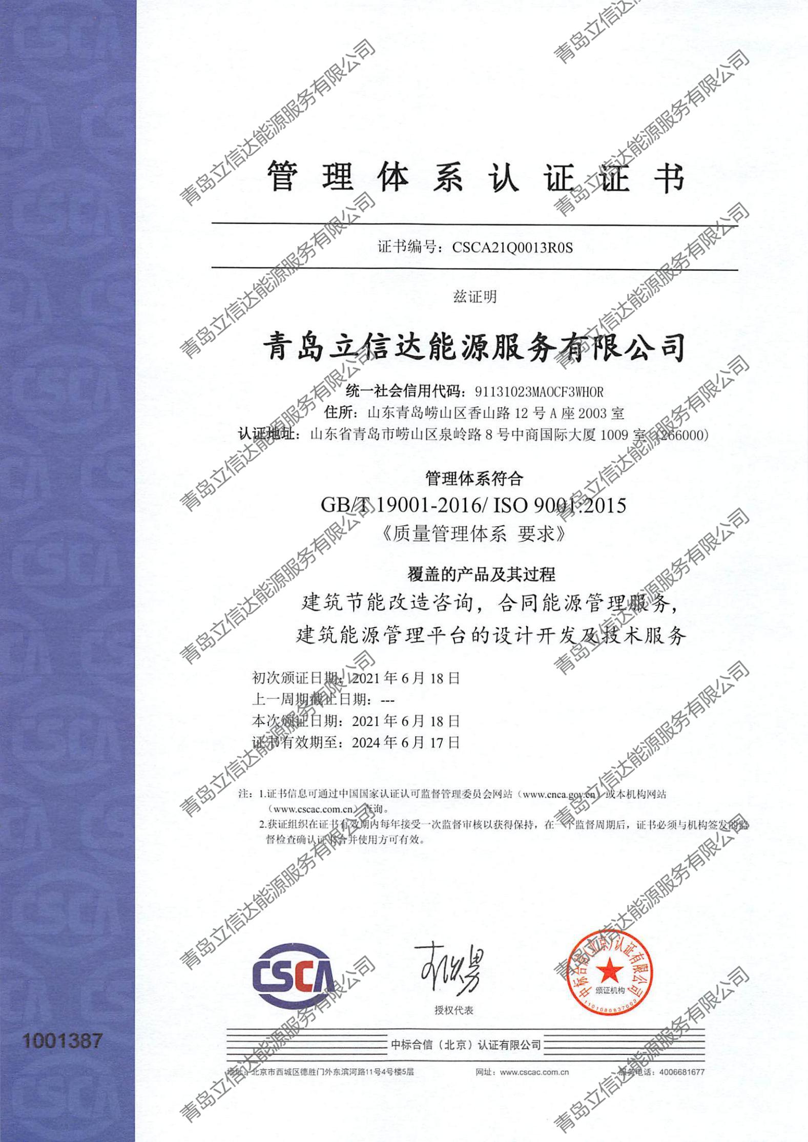 ISO质量管理体系认证证书