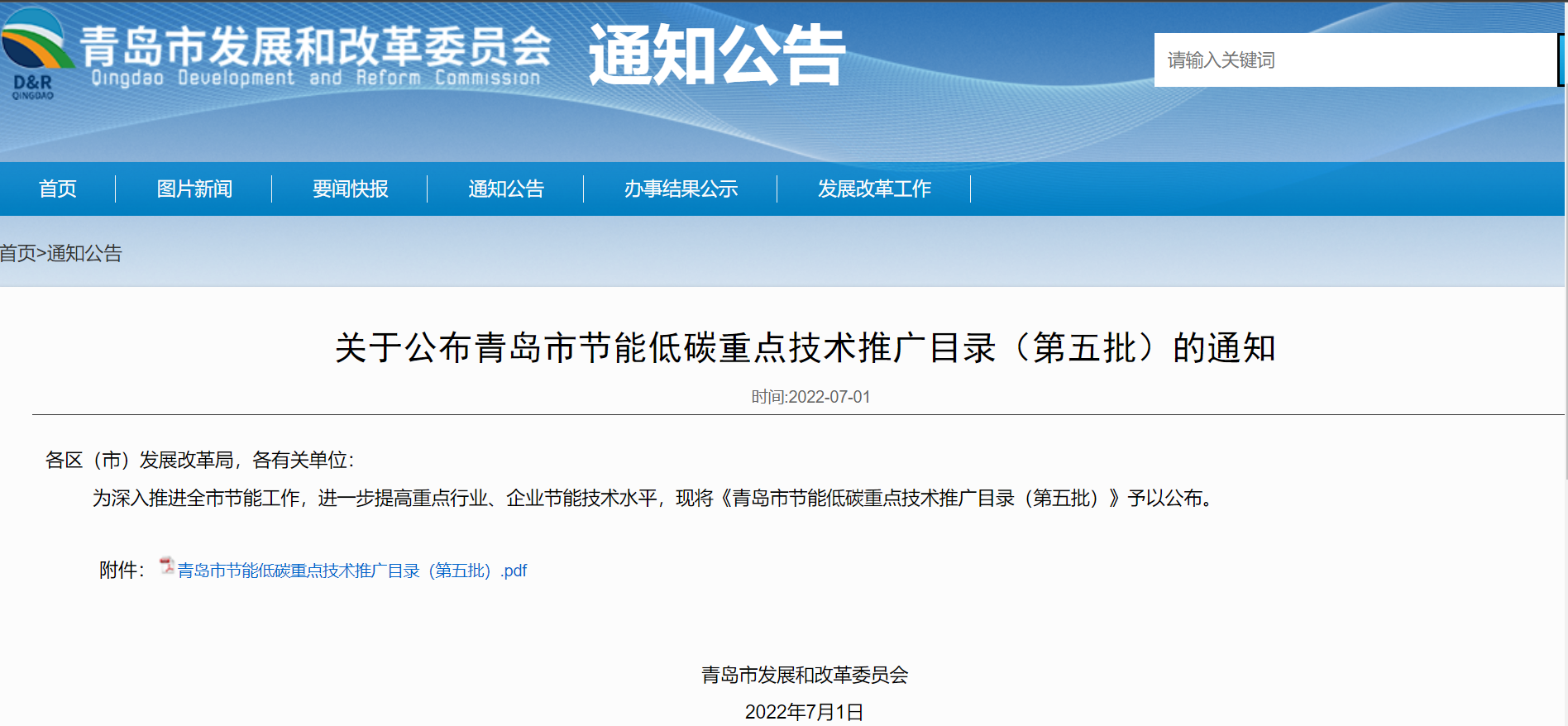 为贯彻落实国家碳达峰碳中和战略部署,促进节能低碳技术 发展和推广应用,进一步提高全市绿色低碳水平,经区(市)推荐、专家评审等程序,青岛发改...